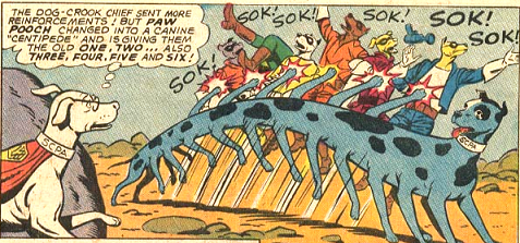 Paw Pooch is an alien canine superhero, resembling a dalmatian, who possess the ability to grow and retract multiple pairs of legs and extend them to great heights. He is an ally of Krypto the Superdog, being a member of the Space Canine Patrol Agents.