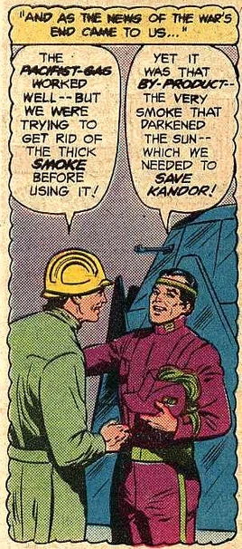 Pir-El consulted with a chief scientist named Jes-Mo, and instructed him to provide his forces with a weapon that could stem the tide of battle. Working under an extremely limited time frame, Jes-Mo soon provided Pir-El with an experimental missile. Pir-El launched the missile towards Erkol. As the projectile entered the city's boundaries, it released a black cloud of chemicals blinding their sensors and disrupting the solar powered robot ships. The cloud contained a chemical agent, which altered the personalities of those caught within its sphere of influence. Everyone affected by the chemical cloud adopted a passive demeanor and elected to make peace with the city of Kandor. The Last War came to a close and the ruling council of Kandor honored Pir-El as a great military hero. A statue honoring Pir-El was erected and placed within the El family vault on the planet, Rokyn.