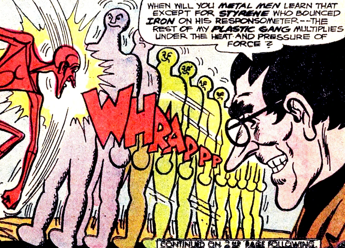 The Metal Men had a difficult time defeating the Plastic Perils with Dr. Bravo taunting them that plastic was the future. They were eventually defeated when Gold, the leader of the Metal Men, studied the properties of plastic and learned of their low melting point. The Metal Men then used this knowledge to pour molten metal on the Plastic Perils, which destroyed them, and captured Dr. Bravo.