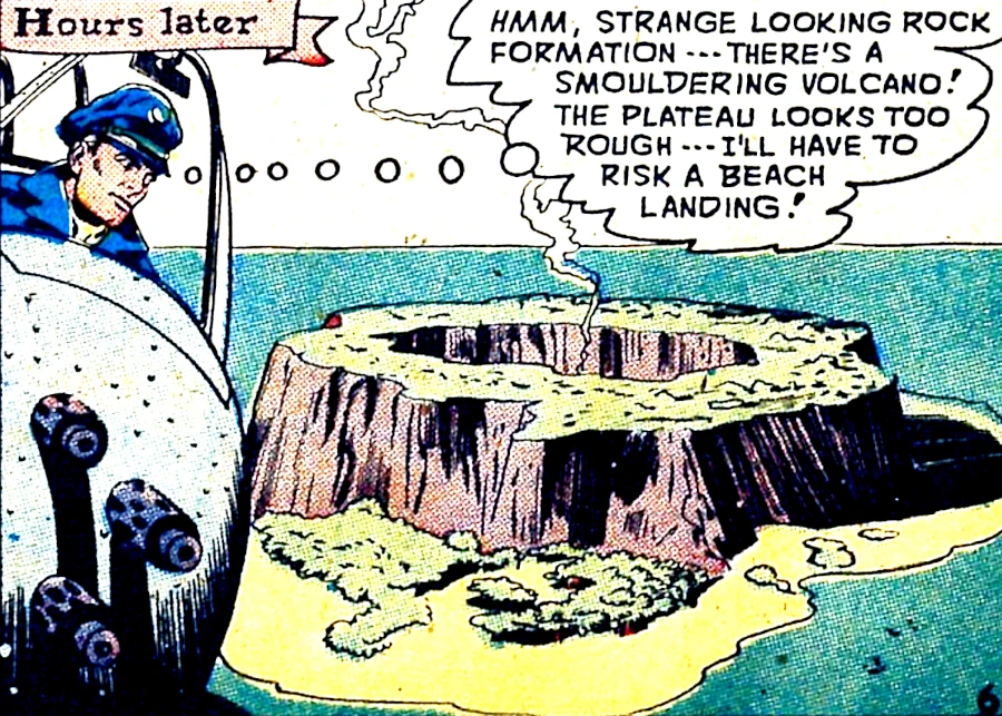 In 1947, while investigating the massacre of a merchant ship's crew, Blackhawk discovered an island in the Pacific Ocean with an enormous ring-shaped plateau on much of the land, surrounding a valley, in which a smoldering volcano was pouring out smoke. Landing on the beach and following a tunnel under the plateau into the interior, Blackhawk found a dense forest where dinosaurs and primitive humanoid giants lived. The giants were enthralled and ruled by a renegade anthropologist, Dr. Mendoza, who had a plan. He would train and discipline these slaves until he had enough of them to invade the civilized world, and conquer it. Blackhawk attacked him, empty handed, but his hench troglodytes subdued and imprisoned him, briefly.