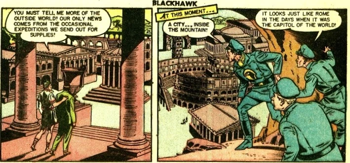 On only one known occasion, in 1951, Publius was reached, via an enormous automated opening in the side of a mountain, thru which multiple aircraft could fly. The famous Blackhawk Squadron are the only known visitors to this nation. Several important secrets of Publian technology were entrusted to the Blackhawks, by Emperor Tiberius, and in return they have kept secret the existence of Publius.