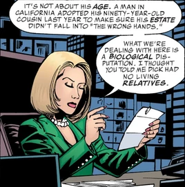 She represented Bruce when he petitioned to adopt his former ward Dick Grayson.[2] She informed him there was a challenge to his petition,[3] but the adoption eventually went through.