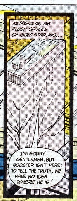 The top two floors of Reilleau Towers housed the headquarters of Booster Gold's Goldstar, Inc. business and Booster Gold's penthouse residence. The first Reilleau Towers building was destroyed by Shockwave. Booster Gold had planned to finance a second Reilleau Towers building, though he was bankrupted by the Manhunters before the project could be completed. It is unclear if the second Reilleau Towers was ever finally erected.