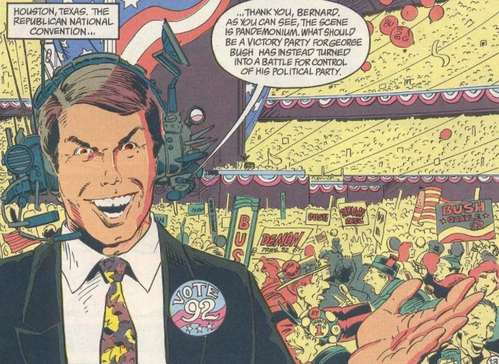 In 1992, Etrigan the Demon ran a highly successful political campaign for the Republican nomination against George H. W. Bush. Etrigan, having been magically summoned due to a political analyst accidentally inputting the information for an ideal Republican candidate, ran his campaign with the intention of declaring war on both Heaven and Hell with the United States' military if he were to win. Though he gained a lot of attention, Etrigan conceded, and Bush was elected.[6]