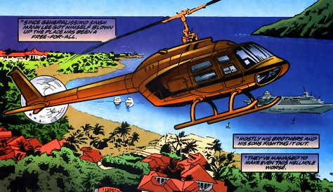 In Rheelasia, at the opening ceremony of a new natural gas facility, Generalissimo and President for Life Singh Manh Lee was killed in an explosion, along with about five thousand spectators, leaving ten thousand injured survivors. The Green Brotherhood eco-terrorist group claimed responsibility.