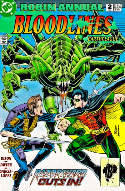 - Each of the Bloodlines annuals for 1993 introduce a new super-hero character. This issue introduces the character "Razorsharp".