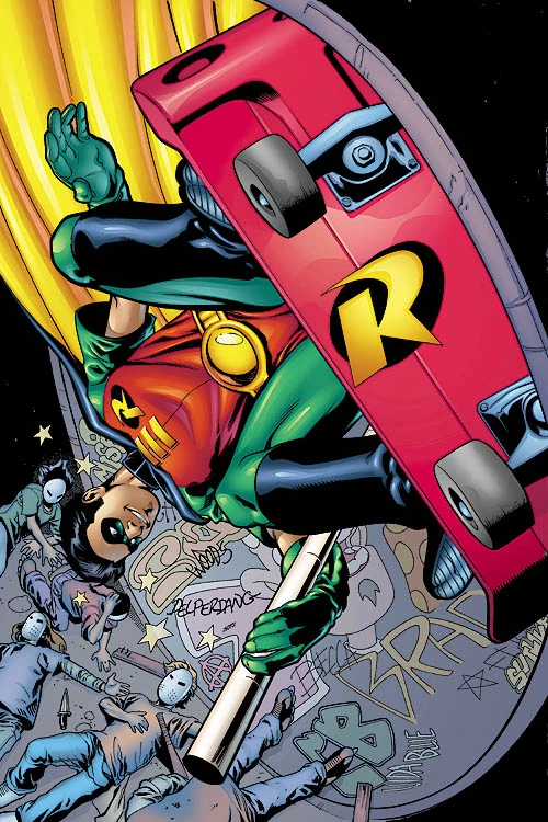 Despite living in the Brentwood Academy now, Tim still tries to sneak into the night as Robin. But with the Dean's pup dog Cardigan around, silently roaming the school area proves rather difficult. But on this night the dog makes Robin aware of some masked kids on skateboards who are causing havoc on the campus. Robin does not interfere and heads back into his room, but before getting some sleep his schoolmates come in and talk about the masked kids. They are called the Sk8Bratz and are now responsible for a crashed police car.