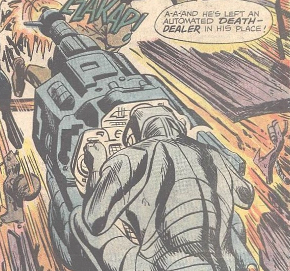 To escape being arrested by the police Tombstone Greer activate a pair of Apokoliptian robots to shoot at them,thus creating the perfect distraction for him to escape underground.