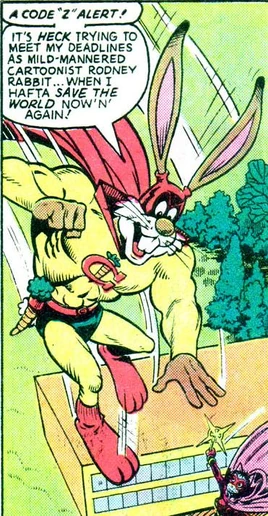Roger Rodney Rabbit[1] of "Gnu York" was a normal comic book artist. While working at Wombat Communications, Roger encountered Superman of Earth-One, who had accidentally pierced an energy barrier created by a strange, glowing meteor that teleported him to the Earth-C dimension. After a brief exchange between the two, Roger began eating a mysterious glowing carrot from his windowbox, which, unknown to him, was struck by a meteorite fragment originating from the same meteor that sent Superman into Earth-C. Unaware that anything was amiss, he soon developed a muscular physique, super-hearing and the ability to bunny-hop clear across the city. Roger donned a costume he acquired from a costume party and became the superhero known as Captain Carrot. Across the country, other animals experienced similar transformations. Roger met with these super-powered critters and together they formed the Zoo Crew.