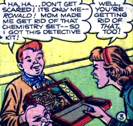 Noted for his over-sized buck teeth and bratty demeanor, Ronald eagerly assisted his sister in a plot to prove that their neighbor Clark Kent was actually the teen super-hero known as Superboy. Their plan nearly exposed Superboy's dual identity, particularly when Ronald sprayed Clark Kent with perfume and noticed later that Superboy cast the same odoriferous scent as Clark Kent. Superboy's quick wit protected his identity when he convinced both Ronald and Lana that the boy had accidentally spilled perfume on himself, which is why he smelled it on both Clark Kent and Superboy. Superboy also tried to convince the amateur detective that all of his suspicions were the result of a vivid dream. The plan ultimately succeeded and Superboy maintained his secret.
