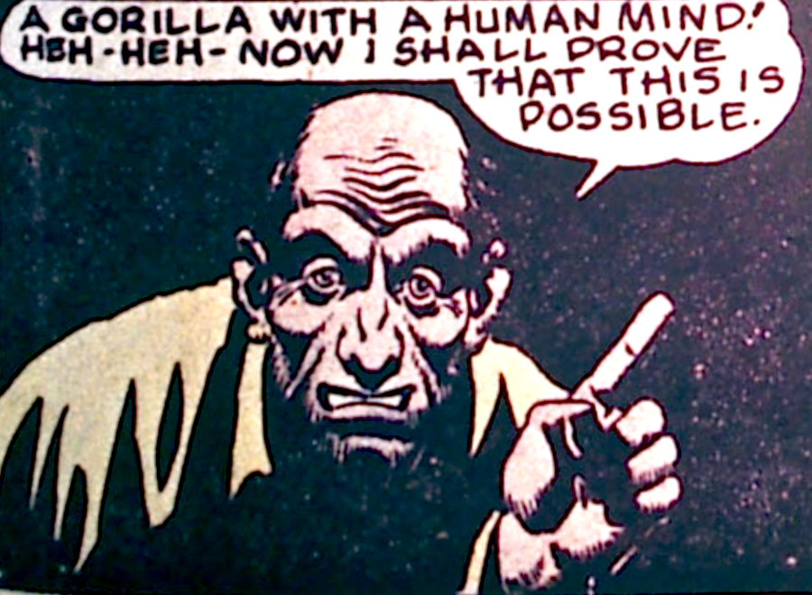 In the mid-1930s, in a farm house not far from New York City, Roskoffin transplanted a live human brain into a live gorilla, just to prove it could be done. It could, but it worked out badly for Roskoffin, who was last seen falling into New York Harbor, in the grasp of an enraged gorilla.