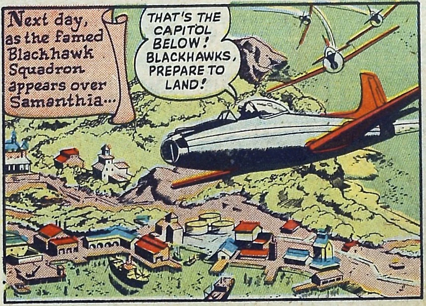 Samanthia has a President and a Legislature, with a Minority Bloc that's aligned with the Reds. In post-World War II Europe, the small, Mediterranean seacoast democracy of Samanthia endured a prolonged famine. The US government sent a series of ships with cargoes of food, but these were intercepted, fifty miles off the Samanthian coast, and sunk by submarines. A third ship got through, due to an intervention by the famous Blackhawk Squadron, and all four of the submarines were caught on the surface, and hit with bombs. The ownership of those submarines has never been proven, but they are widely believed to be of Soviet origin.