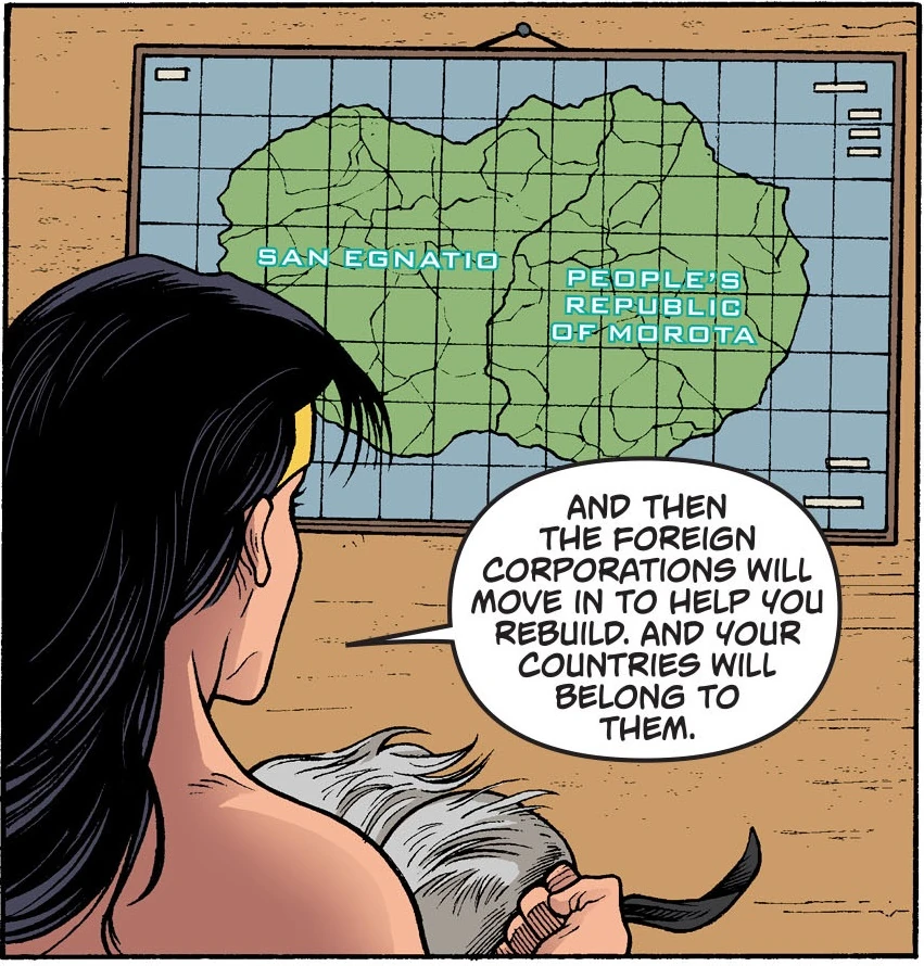 It is a right wing dictatorship ruled by president Flores, locked in a constant war with its Marxist neighbor Morota. However, as both nations wanted trade sanctions lifted, they agreed to talks, led by the neutral Wonder Woman. The talks were also of interest to the nations' inland neighbors, who wanted access to the canal and port the countries had, and the United States was interested in unexplored mineral and gas opportunities.
