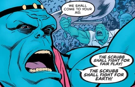 When the Scrubb became aware of the potential for destruction posed by the human race, Rat'lar the Scrubb leader, challenged Earth's champion to box the Scrubb champion with the fate of the Earth hanging in the balance. After a warmup fight between Muhammad Ali and Superman to determine Earth's champion, Ali moved on to fight Hun'ya of the Scrubb. Although Ali beat the Hun'ya, Rat'lar ordered Earth destroyed anyway. With that, Hun'ya stepped in and deposed Rat'lar. Hun'ya explained that Rat'lar had convinced the Scrubb that Earthlings were dishonorable and warlike but Rat'lar revealed himself to be the one without honor.[1]
