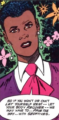 She later returned to Gotham where Bruce paid for her full-time care, and she began to heal people brought to her by her nurses.[17] Leslie Thompkins brought Azrael to see her when his health failed; however, Kinsolving couldn't heal him because there was nothing actually wrong.[18]