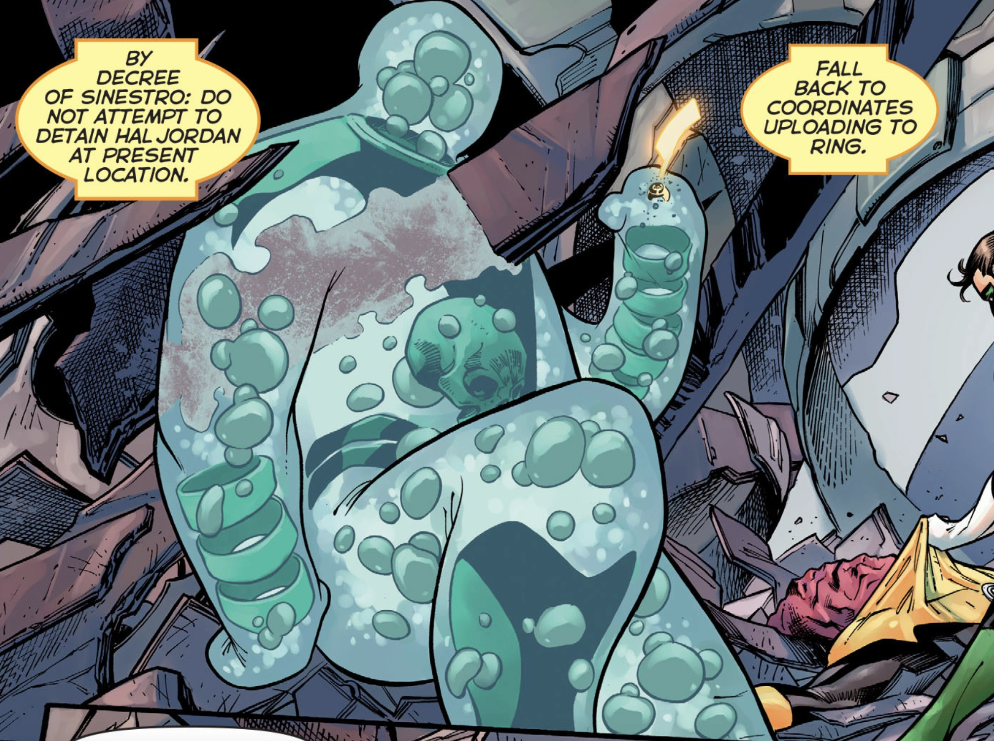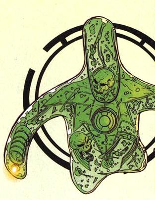 Slushh is a member of the Sinestro Corps in charge of Sector 3376. This makes him an enemy to Green Lantern and the Green Lantern Corps. He is a polymorphic globular being composed of highly corrosive acid. His body is capable of instantly liquefying flesh, making him one of the most terror-inducing creatures in the universe. The Yellow Lantern Ring he wears allows him to create energy constructs, and it is powered by the fear he inspires. Slushh was created by Geoff Johns and Ethan Van Sciver, first appearing in Green Lantern: Sinestro Corps Special #1. (2007)