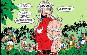 The New Guardians first met him in Colombia, with Snowflame defeating and almost killing them. In their second battle, the New Guardians attacked Snowflame and his followers at his compound. They threw him into a chemical-synthesizing shed, which exploded, killing Snowflame and some of his cartel.