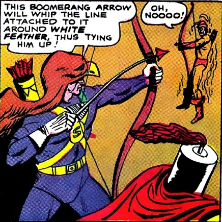 The Vendetta began a crime spree, interrupted after Merryman managed to defeat Man-Mountain (again, through pure luck). The Sparrow fired a Boomerang Arrow to tie up White Feather, but missed and tied himself up in the process. Defeated, he was arrested with the rest of the Vendetta.