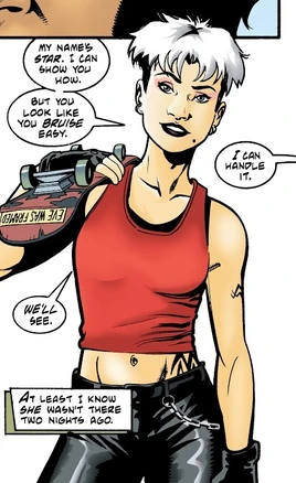 Star taught Tim how to skateboard.[1] Later, Tim followed her when her boyfriend drug her to a gun deal with the Bandidos Biker Club. The deal went south and he and Spoiler saved Star's life after she was shot in the side.[2] Stephanie visited Star in the hospital in an attempt to uncover Robin's secret identity but she wasn't able to piece it together.[3]