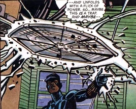 Static's first disc was designed and constructed by himself.[2] The disc consisted of eight interlocking plates that, when not in use, were folded up like the sections of a Chinese folding fan.[2] This made it easy for Virgil to hide the disc in his duffel bag.[2] When he went into action as Static, Virgil gave the sections of the disc the same magnetic charge so they unfolded via magnetic repulsion and locked into place to form a three-foot wide circular platform.[2] When Static gave the sections opposing charges, the disc folded back into its compact size via magnetic attraction.