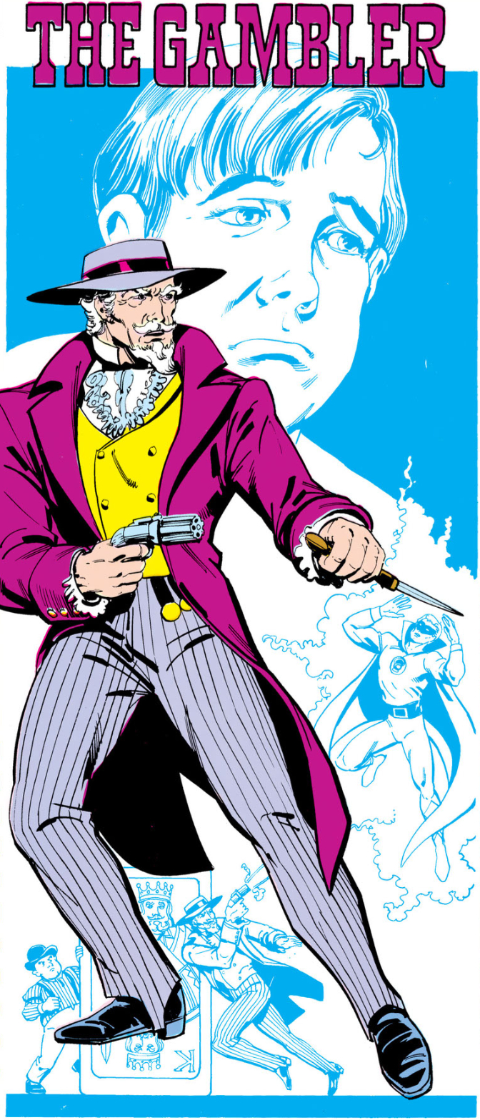 Over the next several years, Steven spent time with a traveling carnival, learning the art of makeup and becoming an expert with throwing knives and pistols. Embarking at last upon his new career of crime, the Gambler quickly became one of the most wanted men in the country.