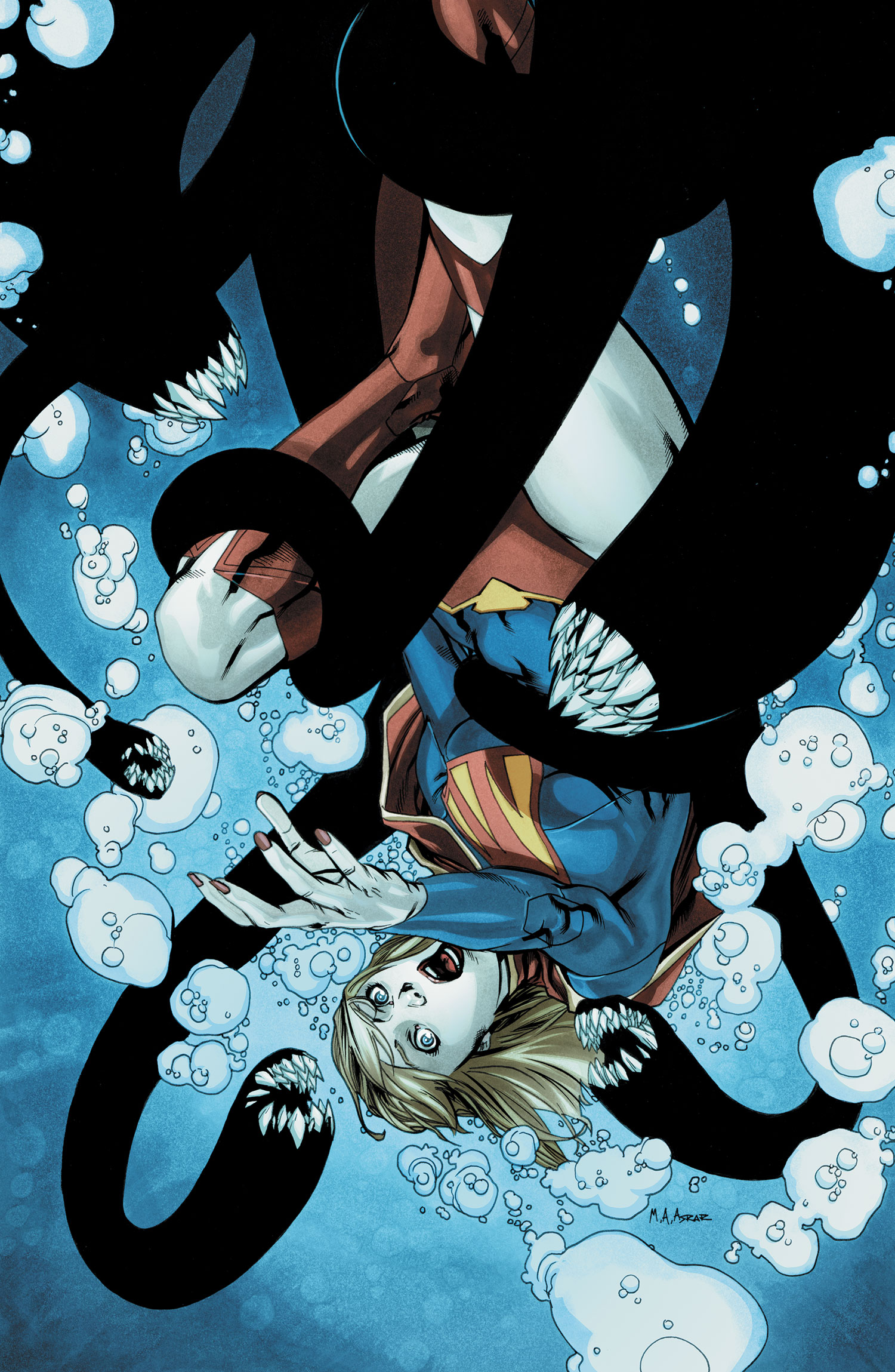 Kara speeds off until she suddenly hears the sound of a voice calling her name from below the ocean's surface. The voice sounds mechanical, and Kara assumes it must belong to the remains of her pod. She takes a deep breath and swims down into the darker depths. It becomes too dark to see as she goes deeper, so she uses the energy she has stored from the sun to create heat and light which keeps her dry and allows her to see. She follows the voice down to the bottom, but she is soon attacked by the disturbing creatures that live in the ocean's deepest depths. She struggles with them until she realizes that her heat-vision is an effective weapon. Unfortunately, one creature wraps its tentacles around her neck, and she is forced to gasp for air, and she passes out as her lungs fill with water.