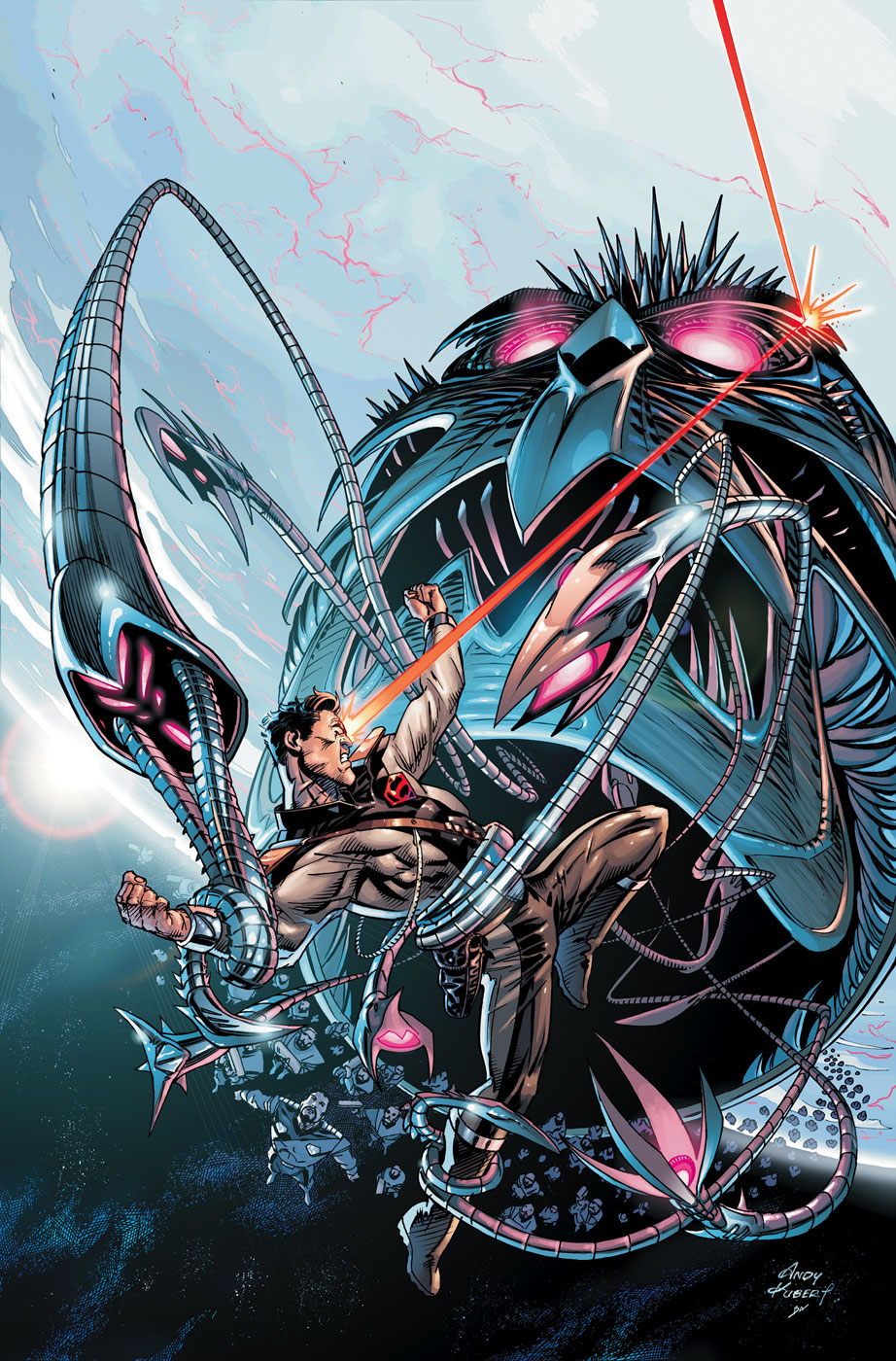 Brainiac is unleashing his robot troops onto New Krypton and the Kryptonian citizens rise up to fight the drones. Zod fires New Krypton's planetary cannons at Brainiac's ship. But Brainiac's force-field withstood the attack and the cannon only killed the Kryptonian's in the way. Kal-El furious at Zod for allowing the people to die, becomes Superman. Meanwhile, Supergirl saves her mother and realizes the probes are attacking political leaders. Supergirl sends Alura to Zod while she defends the city and orders the troops. Superman enters Brainiac's ship while Zod and Ursa contemplate the next best step. A Brainiac probe hits Kara with red sun beams she is saved by Superboy and the Legion of Superheroes, who reveal to Zod that other planets are in Brainiac's ship. Zod sends Supergirl off and arrests the Legionnaires. Superman is about to face off against Brainiac when he is floored by a blast of Kryptonite. By none other than Luthor who is working with Brainiac.