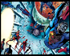 The organization began in the early days of the 21st century, in a form known as the Supermen of America, a grouping formed by the original 'Prime' Superman made up of his closest allies so that he could call upon them in dire situations.[1] In time this gathering would evolve into theSuperman Squad, centered in the Fortress of Solidarity--a tesseract housed in a pentagonal icositetrahedron within the Still Zone--where they may survey all of reality, defending it against the most titanic of threats to the structure of spacetime.
