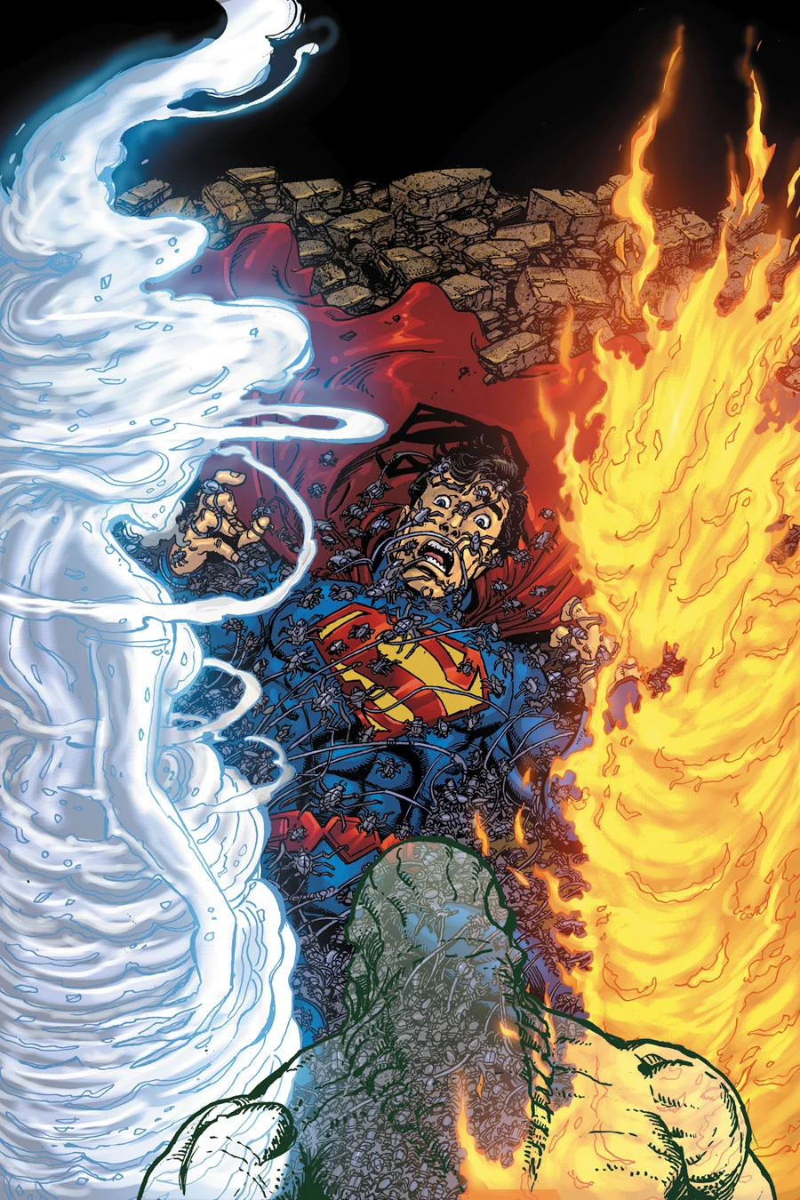 Frustrated, Superman attacks all three of the aliens, causing numerous 'flaws' in their reference matrices. Despite the appearance that he has defeated them, he hears a thought in his head suggesting that the creatures are commencing some kind of merger. Soon after, a swarm of mechanical insects congregates before him, and it keeps coming, no matter how he tries to destroy them.