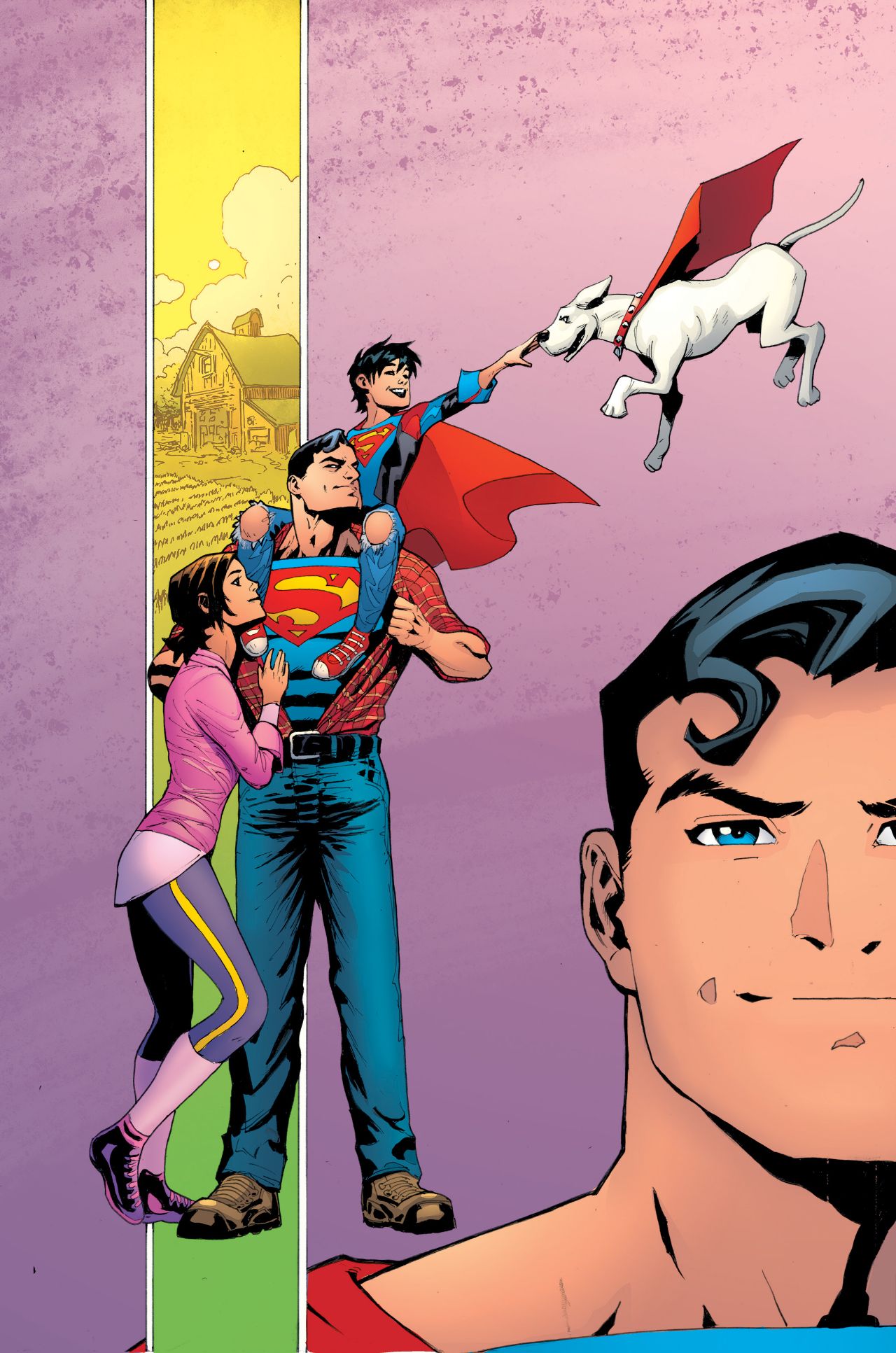 Meanwhile at Hamilton County, the Smiths prepare to celebrate Clark and Lois' wedding anniversary. Jon provides his parents with presents; a journal for Lois and a farming book for Clark. The Smiths blow the candles on the cake celebrating the occasion until the doorbell rings. Jon and Krypto go to greet the visitor, only to find a book lying on the entrance and the human Clark walking off into the distance.