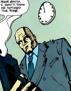 Every other member either died or went insane, and Synth was left with a constantly mutating brain, which caused him to spend alternating days as a genius and barely functional moron. He became a hired thug for the crime lords of Vanity.