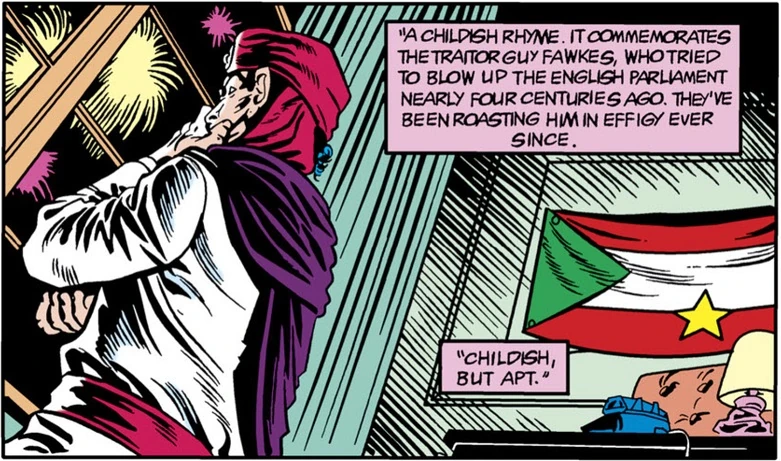 A Syraqi terrorist calling himself Abu Hassan, with a good alibi and diplomatic immunity, sent a squad of suicide gunmen into Gotham City to shoot up a veterans' club. This drew Batman to Syraq's embassy in London. There Hassan was preparing to re-create Guy Fawkes' "gunpowder plot", and blow up the Towers of Parliament. Batman raided Hassan's embassy base, and there was a melee, from which Abu Hassan got knocked through an upper-story window, and fell onto the embassy's spiked security wall, and died. Batman then dismantled the rest of the terrorist gang.