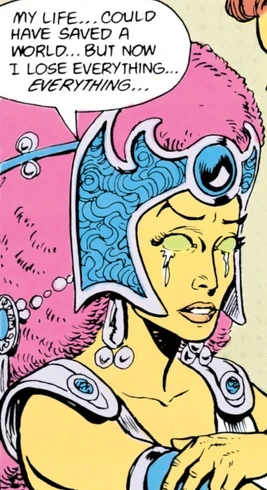 Many years ago Talathus was queen of Tamaran and wife of King Korithus when they were invaded by the forces of the Citadel demanding that she be handed over a slave. Korithus led Tamaranean forces in a counter attack but was killed in the assault, which led to their two older sons also going into battle. They were also killed, which left Talathus and her youngest son, Mythus alive.