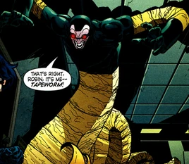 Following their escape, the two were confronted by Robin, Ragman, and Blue Devil who were disgusted to learn of their recent slate of murders and attempted to take them back into custody. Tapeworm escaped by leaving behind a large portion of his tail and Ragman's suit of souls judged Thunderhand and killed him, dragging his soul into the patchwork of the suit. Tapeworm gathered up more than twenty other escapees from the O.M.A.C. facility and tracked the heroes back down to try and get them to release his friend whose death he was unaware of.[1] He lead the other villains in an attack on the heroes which proved unsuccessful and resulted in most of his new allies being recaptured though he himself escaped.[2]