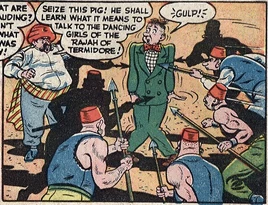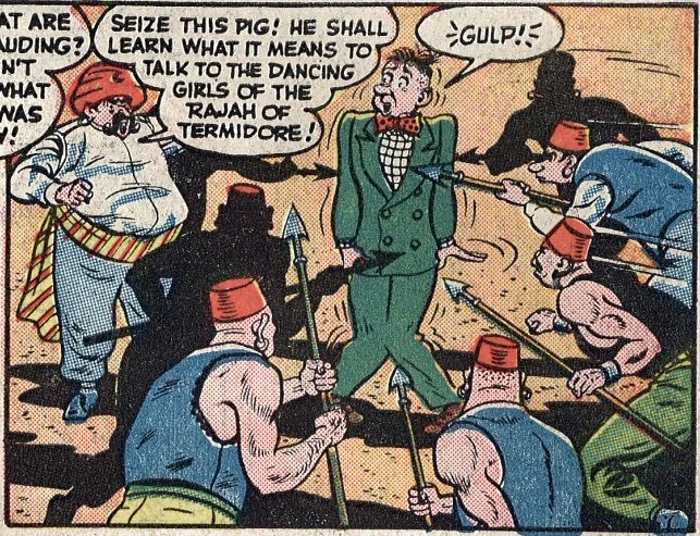In 1946 the fabulously wealthy and famously hedonistic Rajah of Termidore visited his embassy in America and threw a lavish oriental banquet. An American entertainment impressario, Deke Parsons, called at the embassy seeking to book his client, Daffy Dill a woman professional wrestler, for the evening's entertainment. Mr. Parsons wandered out of bounds in the Embassy, and got much too close to the Rajah's harem's dressing rooms, for which he almost got his head lopped off. Miss Dill, meanwhile, due to a series of preposterous misunderstandings, almost became the favorite wife of the Rajah. Daffy Dill beat the hell out of several of the Rajah's spearmen, before some wiser heads among the Rajah's entourage encouraged him to smooth things over quickly, pay off both of these disruptive Americans, and send them on their way. This worked out, and afterward the embarassing incident wasn't mentioned again.