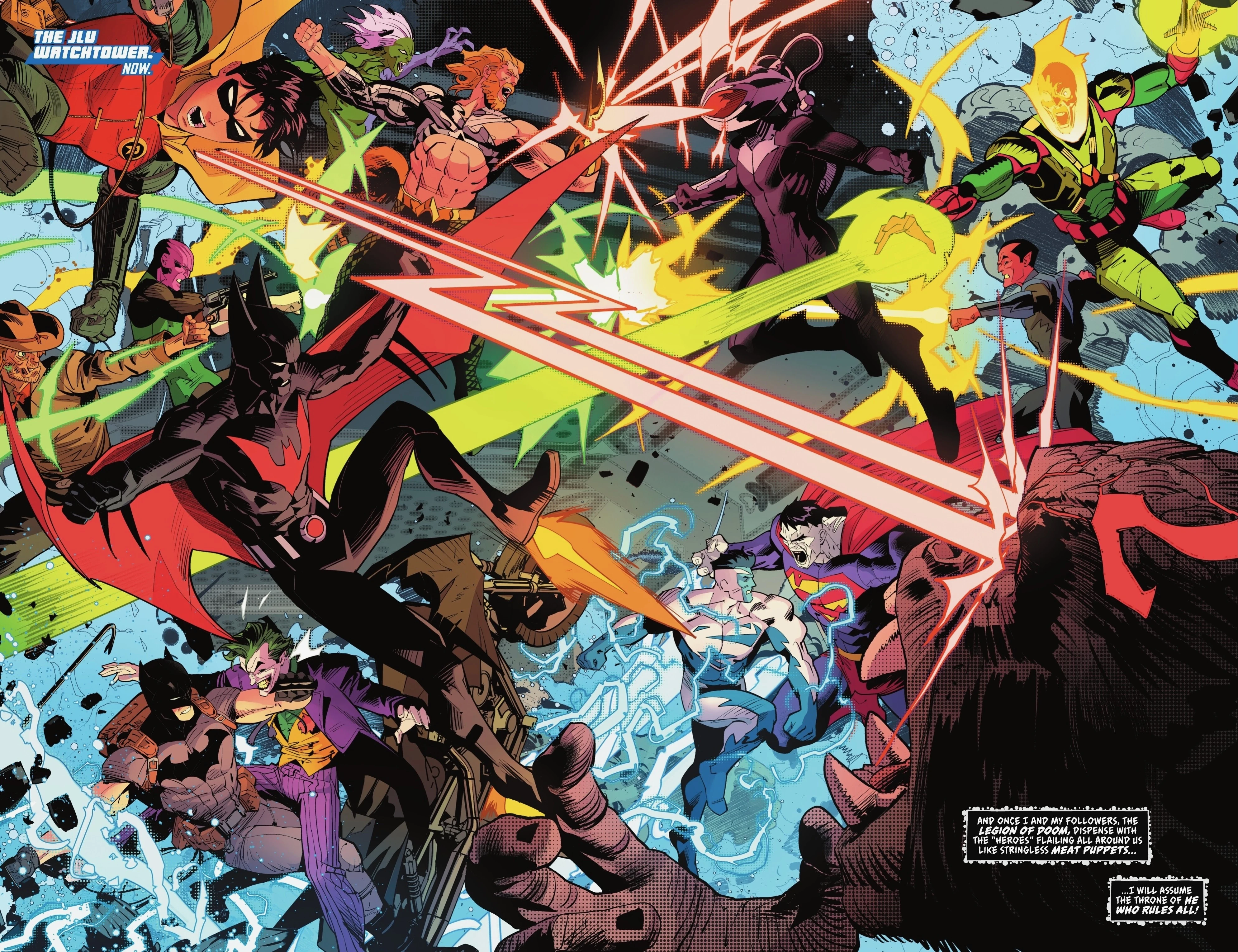 Terry was accidentally taken from his timeline by Air Wave, forming a makeshift Justice League Unlimited from heroes all throughout the timestream to confront an Omega Energy empowered Gorilla Grodd and his new Legion of Doom after they neutralized the present day Justice League.[68] Batman dodged Grodd's Omega Beams while the rest of the heroes fought the legion. After Air Wave managed to bring back the present day Justice League to deal with Grodd, Batman and some of the other time displaced heroes made sure the rest of the legion didn't escape, with Terry knocking The Joker out. After defeating the villains, Batman and the other time displaced heroes were informed by Superman that the league couldn't send them back home, as the Omega Energy was impending any type of time-travel mechanisms, and they should remain stuck in the present until they found a solution.[69]