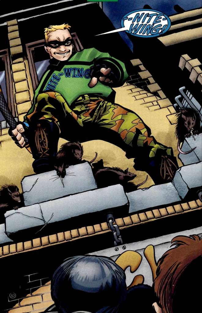 Tad Ryerstad was Nite-Wing, a self proclaimed vigilante of Bludhaven. He'd prowl the streets every day and deal 'justice' to those who do wrong. In reality, Tad is a thug who never listens to reason and merely beats often innocent people. He spent his spare time reading comics that "The Tarantula" had sold to him, thus causing him to take upon the title of "Nite-Wing".