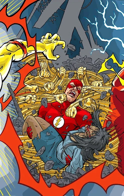 Suddenly, Jay hears ominous warnings to stay out of Flash's impending doom. Suddenly Jay is punched in the face. Neither Wally nor Jay saw what happened. Since no one would be fast enough to hit them unless they were invisible, they aren't sure what happened. Suddenly, Jay is hit again so hard his body is flung back again. They hear the ominous warnings again of Wally and Linda being in trouble.