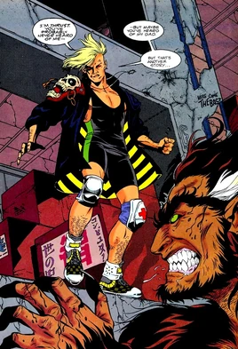Later Thrust revealed he had contact with former Point Force member Brainchild, a mind reader, who knew Aria was being held by the Dominators. Thrust went with a Point Force team to rescue Aria. Captain Flag was waiting for them with a new power boost. After getting knocked around, Timber Wolf loaned Thrust his powers so the two of them could overpower Captain Flag. Flag, who is powered up by Aria's pain, knocked both heroes back. Timber Wolf lost himself in anger and chased after a Captain Flag who lost his power boost when Aria realized her pain was giving them power.[4]
