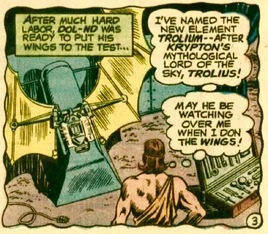 Dol-Nd designed mechanical wings which were powered by the element Trolium, which Dol had named after the mythological Kryptonian Lord of the Sky: Trolius.