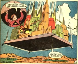 A Pre-Crisis heavy gravity world of the Earth-One Universe exploded and a family was rocketed to safety. The rocket landed on Trombus where the family gained super-powers under the red sun and fought crime as the Hyper-Family.