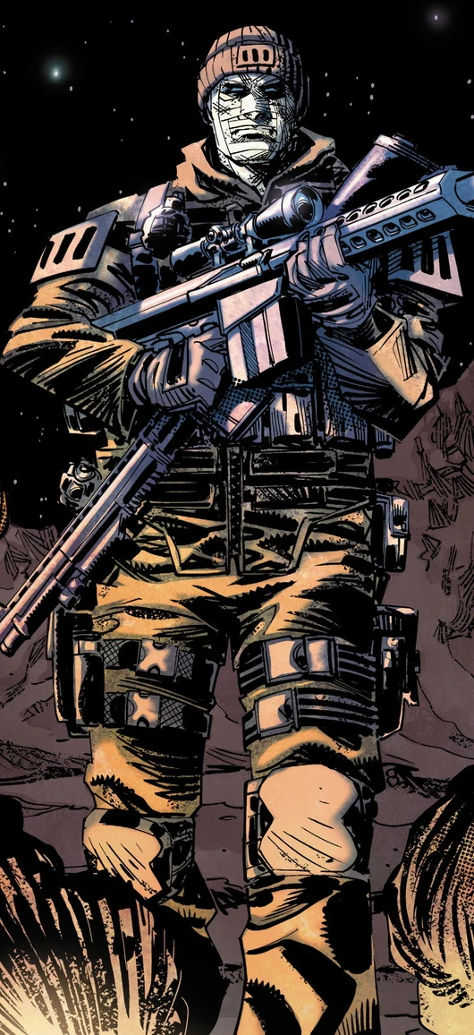 During conflicts in the Middle East, the Unknown Soldier fought in Afghanistan and fought for the United States.[1] Sometime later he was recruited by the Thinker (posing as Amanda Waller via hologram) to be the team leader of a new Suicide Squad incarnation. The team consisted of Steel, Warrant and Power Girl. The team's mission was to extract OMAC from a facility located in the Rocky Mountains.[2] While trying to get OMAC, Unknown Soldier and his team found themselves opposed by the real Suicide Squad.