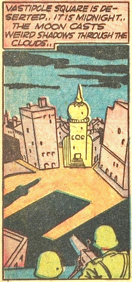 Don Q meanwhile had approached the Vastavian Government with one false story, and the pro-Axis faction of rebels with a similar story, thus arranging for an armed clash between the two groups, at an arsenal near the Vastipole waterfront. That battle got out of hand very quickly and before it was over the government had called in a dive-bomber raid on its own arsenal. After much destruction and loss of life, Petroff turned up alive, and his faction of rebels emerged to take charge of Vastavia.