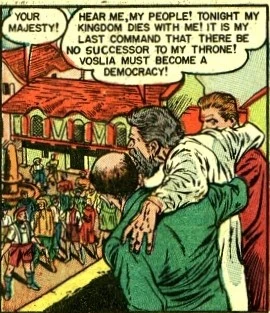 In 1951, Voslia transitioned from being a traditional monarchy into becoming a democracy, by the late emperor's final decree. An abortive attempt was made, by the late emperor's treacherous personal physician, to seize control of the country, using a giant robot, but this scheme was disrupted by the emperor's old friends, the Blackhawks.