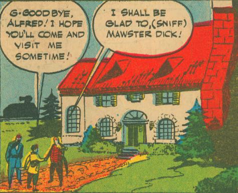 Wayne Manor was then connected to the Batcave through a large staircase. The secret entrance in the house was concealed behind a grandfather clock. Soon, a criminal who escaped from prison broke into Wayne Manor and found the secret entrance leading to the Batcave, but Batman and Robin were able to defeat him.[10]