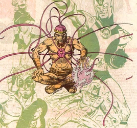 The being called the Weaver was a sinister Atlantean god who was one of the mystically-powered beings known as the Lords of Chaos. 45,000 years ago the Atlantean sorcerer Arion forced the Weaver to allow Arion access to the sorcerous power of some of his mystical "threads."[2] Later, at the request of the sorceress Jheryl, the Weaver "rewove" Arion's soul to restore the magical powers Arion had once possessed.[3] Eventually, Arion exiled the Weaver to the otherdimensional realm called Darkworld under unknown circumstances.