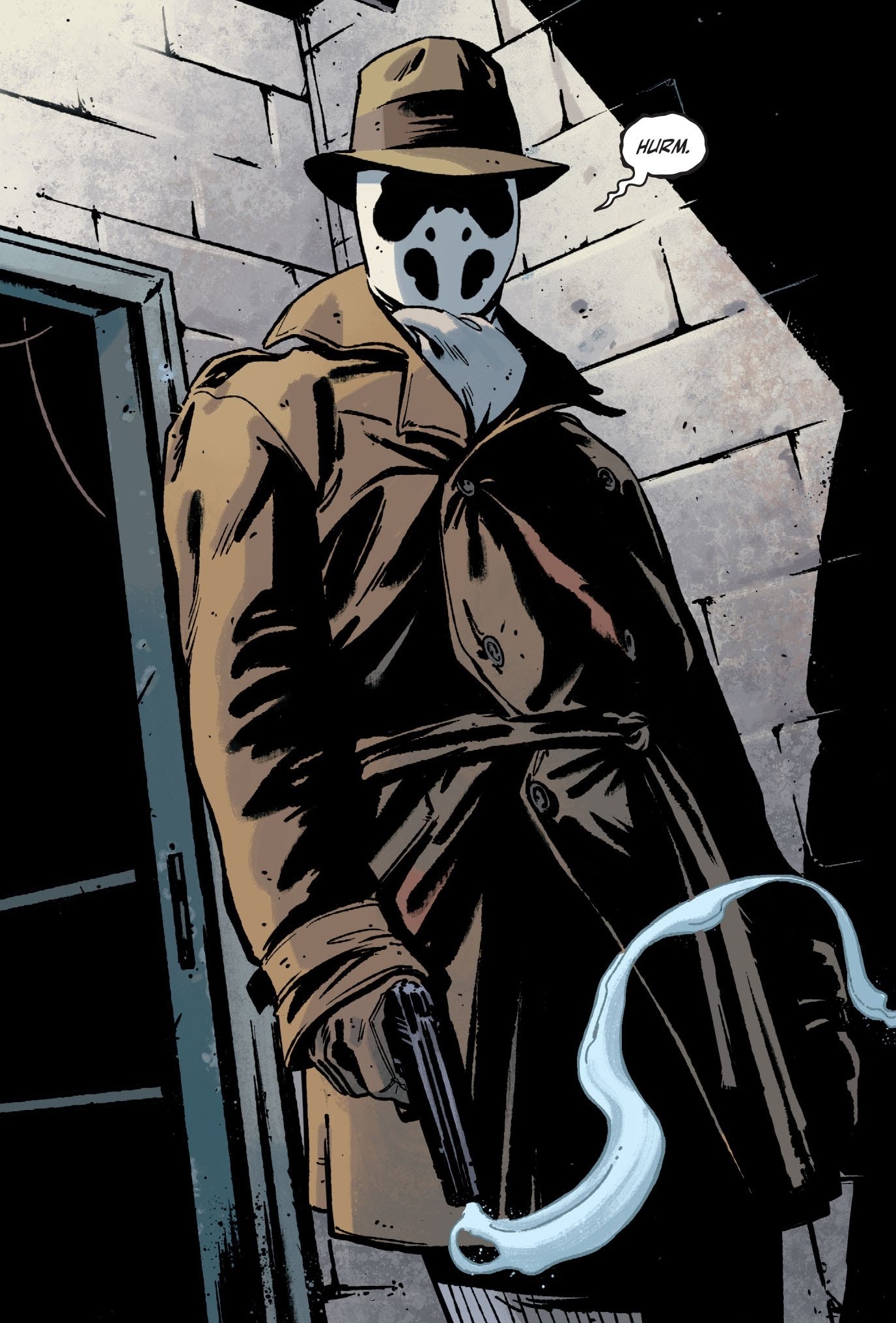 Myerson successfully took down several members of Turley's security when they came after him, however he was soon forced to hurry back to Laura after hearing the United States Secret Service blast a nearby wall. The two would-be assassins were soon shot dead, though the Federal Bureau of Investigation faced problem in identifying Myerson initially due to him not having any driver's licence and his face being damaged due to bullets. After identifying who he was however, they found that his fingerprints mysteriously matched with that of the real Rorschach.[1]