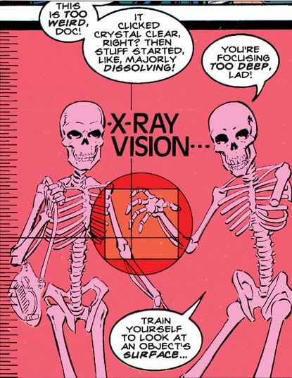 The X-ray glasses maintain the ability to see through solid objects of varying thickness. The user can make adjustments on the glasses accounting for a wider range of depth perception. Superboy's X-ray glasses cannot match the precision and range of Superman's natural X-ray vision.